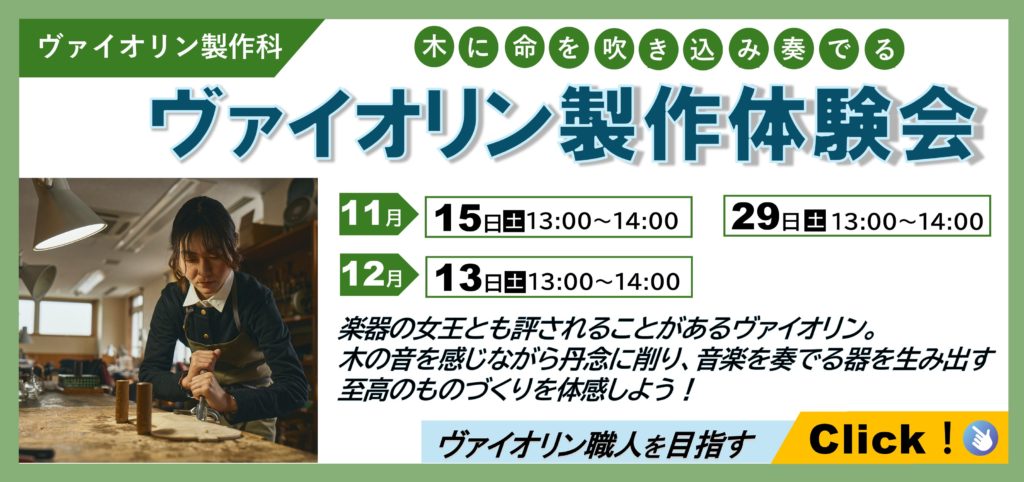 体験に加えて、職人の仕事紹介とヴァイオリン製作科での学びをご紹介!